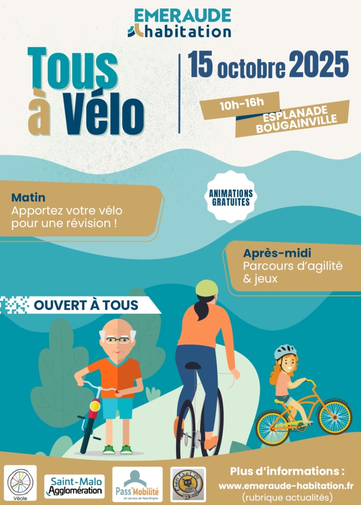 Emeraude Habitation, en partenariat avec Pass Emploi, Véole et Saint-Malo Agglomération, vous invite à une journée conviviale autour du vélo le mercredi 15 octobre 2025, de 10h à 16h sur l’esplanade Bougainville, quartier de La Découverte à Saint-Malo.