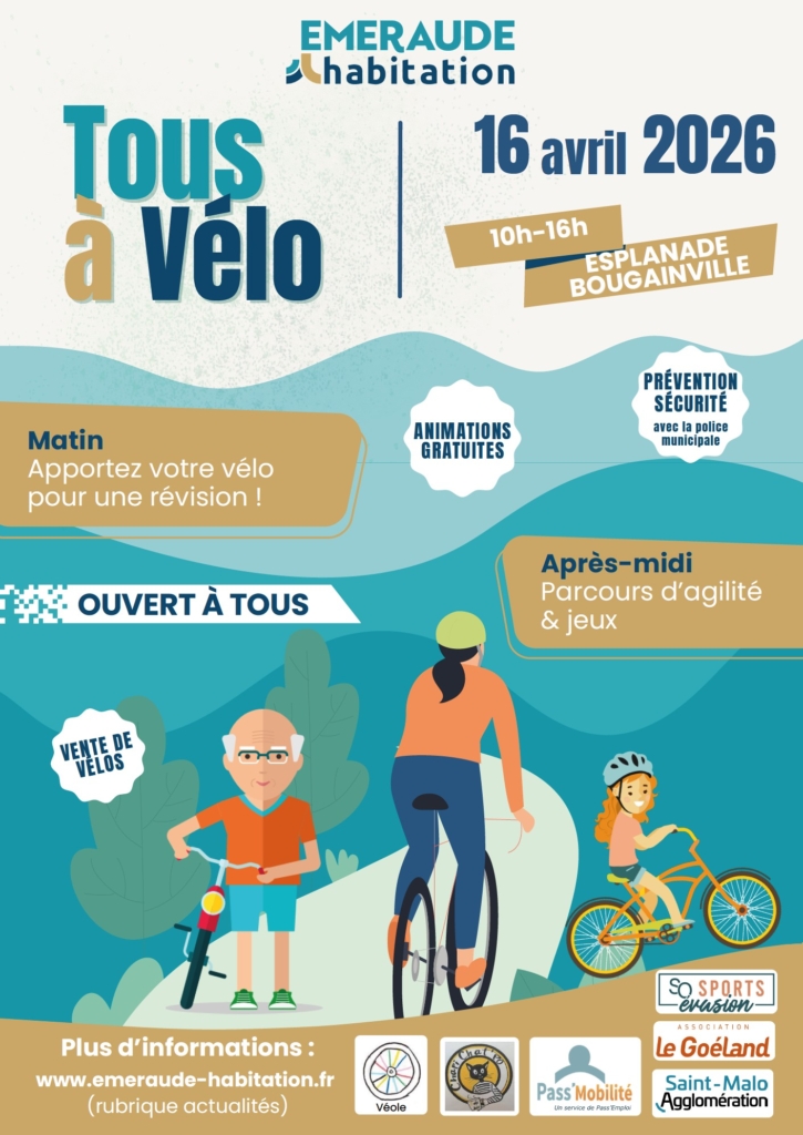 Emeraude Habitation, en partenariat avec Pass Emploi, Véole , So sports Evasion, Le Goéland, la Police Municipale et Saint-Malo Agglomération, vous invite à une journée conviviale autour du vélo le jeudi16 avril 2026, de 10h à 16h sur l’esplanade Bougainville, quartier de La Découverte à Saint-Malo.