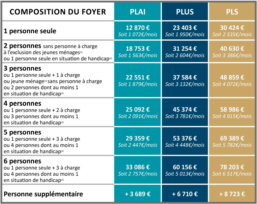 Les plafonds de ressources sont définis selon le mode de financement qui a permis de construire les logements : PLAI, PLUS, PLS :